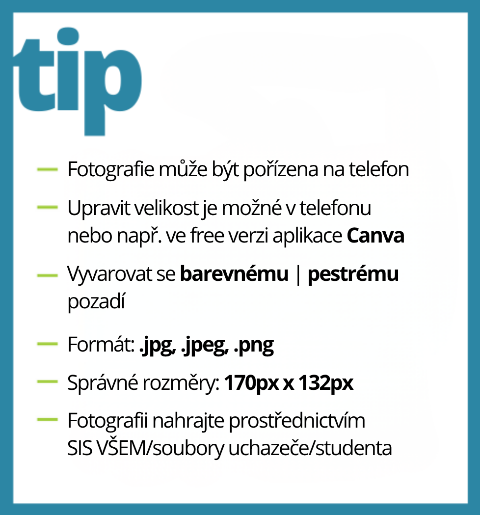 - U průkazové fotografie je nutná jednoznačná identifikace studenta v rámci administrace a kontroly studia na střední škole, proto je nutné dodržet Zákonné požadavky pro průkazové fotografie (výška obličejové části hlavy, velikost snímku, použité pozadí, ostrost atd.).